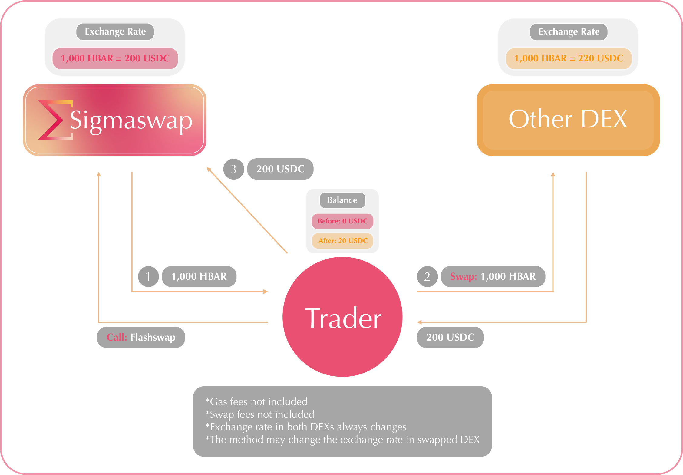 It is quite simple to use Sigmaswap as a liquidity source for the USDC-to-HBAR component of this process. Even though gas fees on Hedera cost less than a penny, looping through protocols in this way is particularly unwise, and can lead to an issue in a volatile market condition.